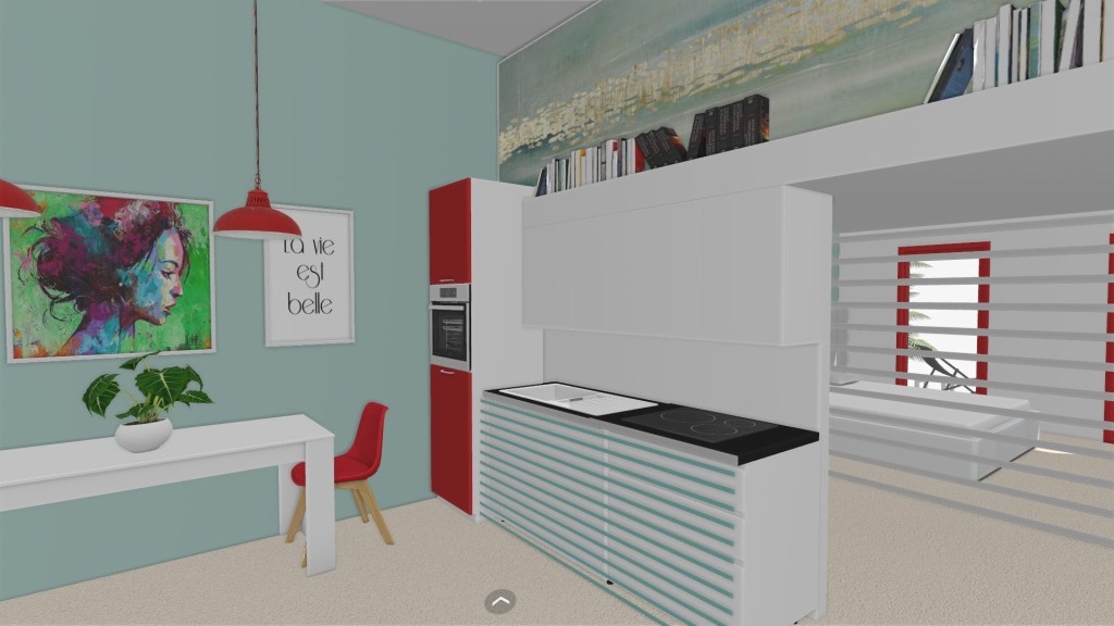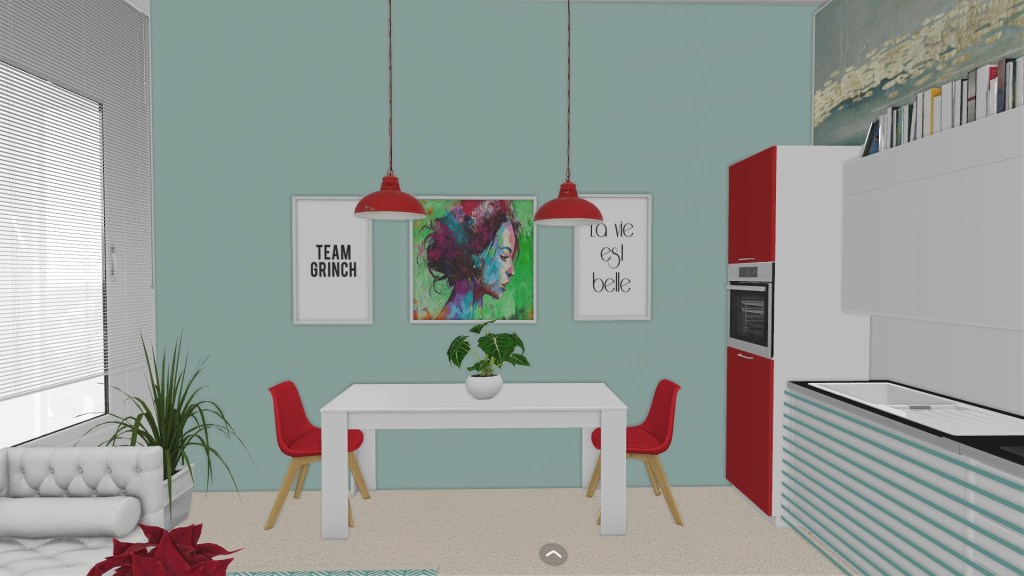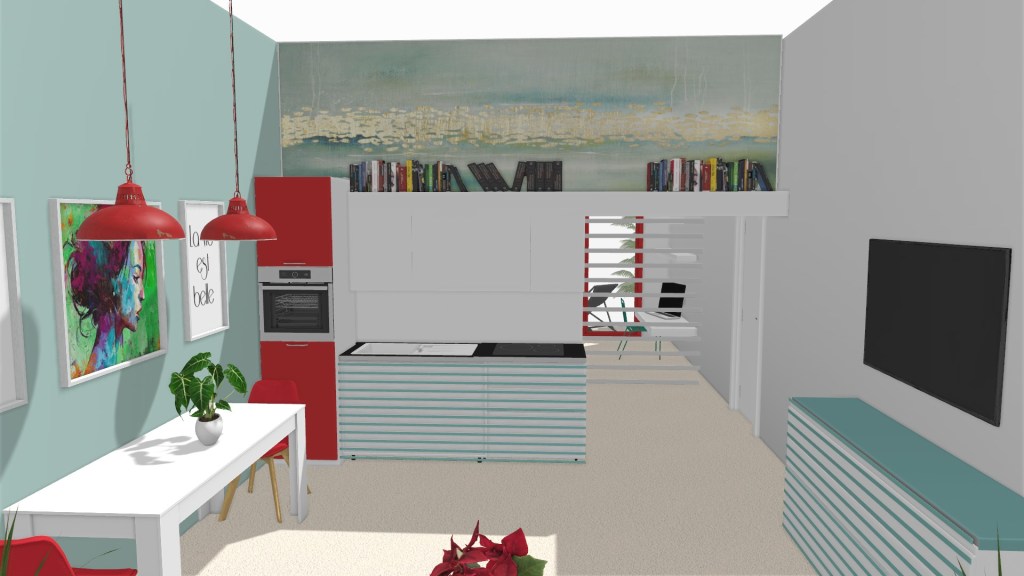 La cocina distribuida en frente. El acento lo pone el rojo en la torre de electrodomésticos, dos lámparas colgantes y las sillas del comedor. No nos olvidamos de las plantas que terminan de dar alegría al conjunto.