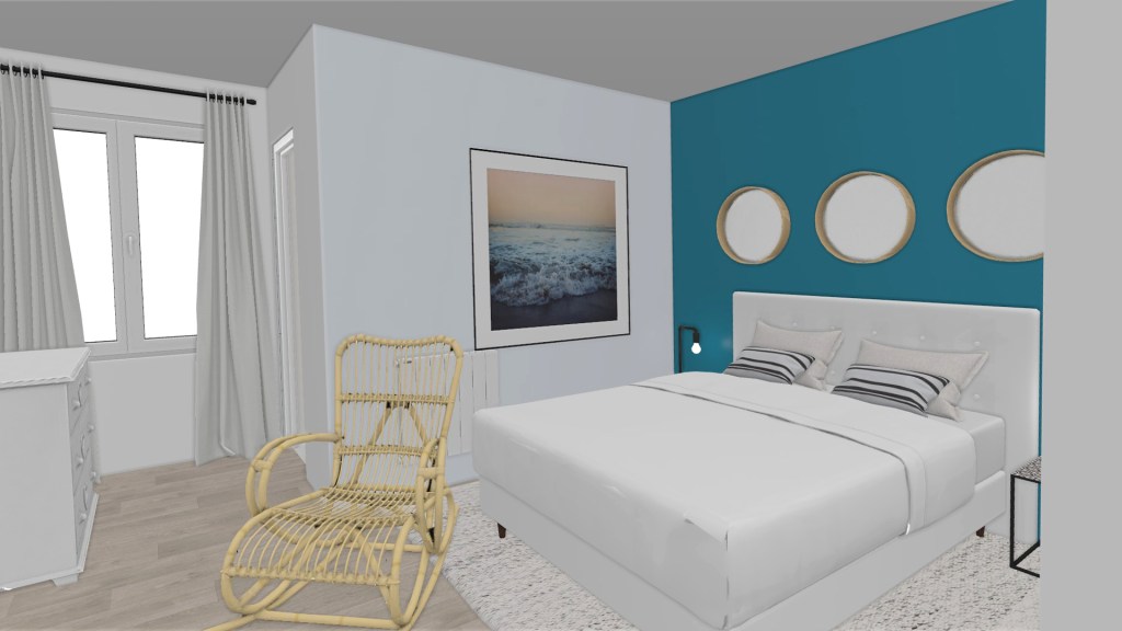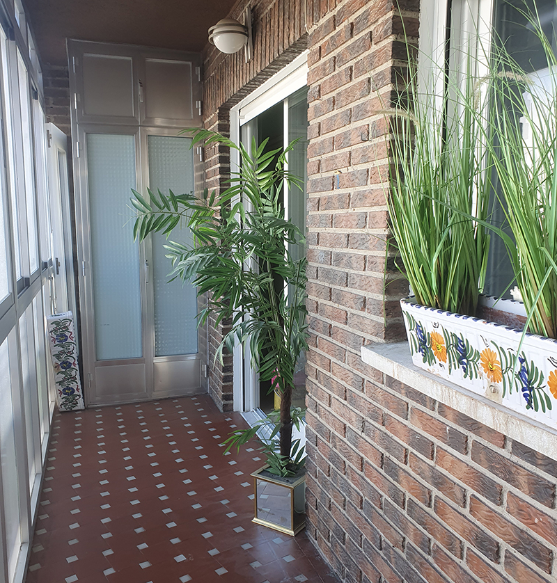Por otro lado, decoramos la terraza en galeria con moqueta de cesped artificial, un gran mural evocando la playa un bonito rincón con un asiento muy cómodo y apetecible.