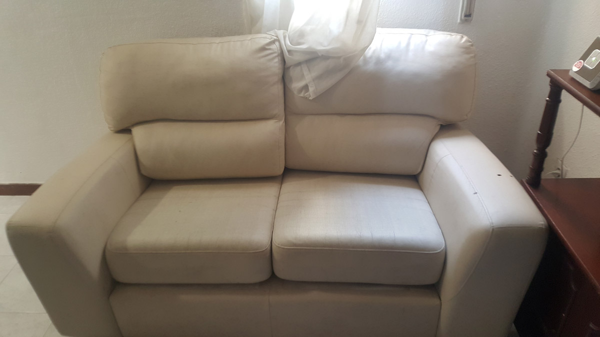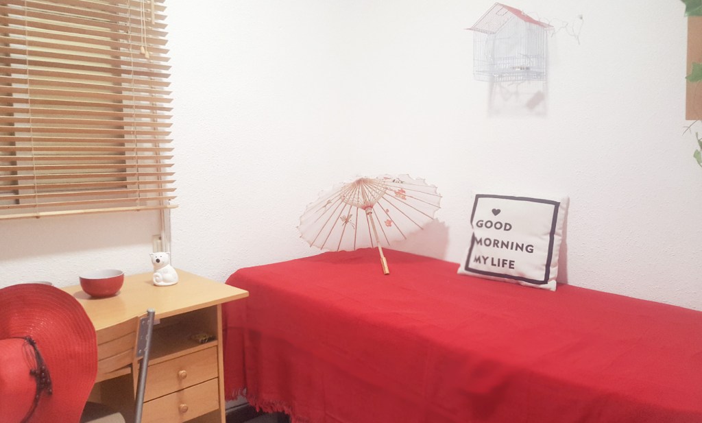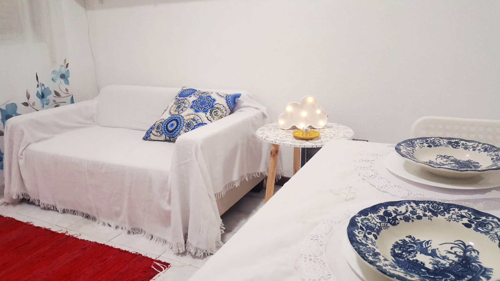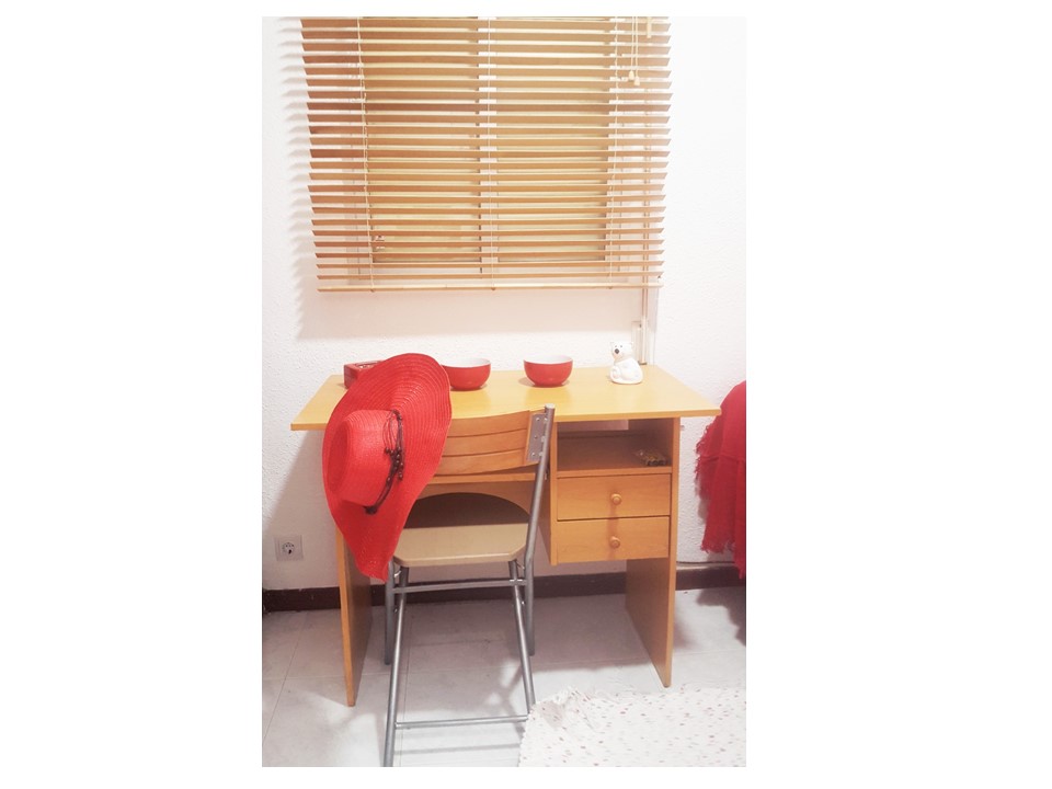 Todo el mobiliario de salón y comedor fueron directos al contenedor (milagrosamente desaparecieron antes de que llegara el camión de retirada de resíduos) El sofá enorme y desgastado fue sustituído por uno más pequeño pero acorde al espacio. En lugar de la mesa camilla busqué una mesa cuadrada extensible blanca con sillas ligeras rojas apilables. Una mano de pintura a las estanterias y mesitas de las habitaciones y como nuevas.