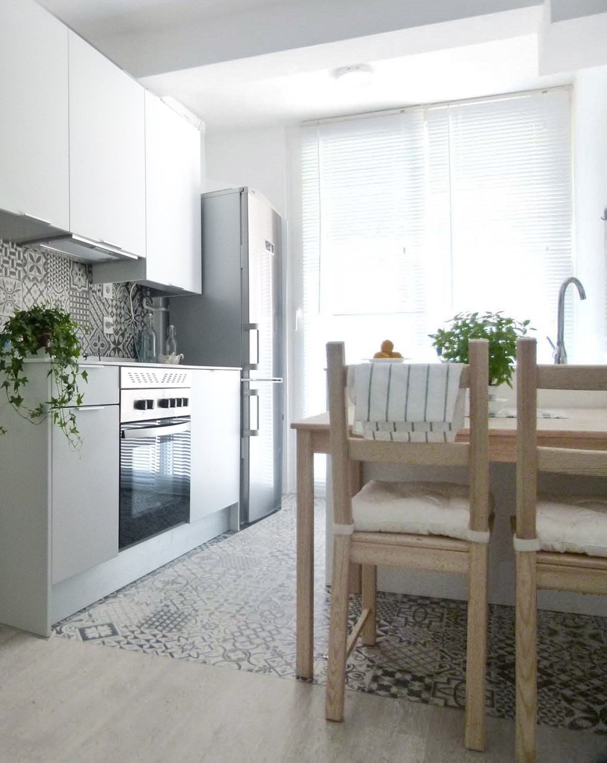 Se realiza una reforma integral conectando el salón y la cocina creando un espacio único con ventilación cruzada entre las dos terrazas, ganando muchísima luminosidad.