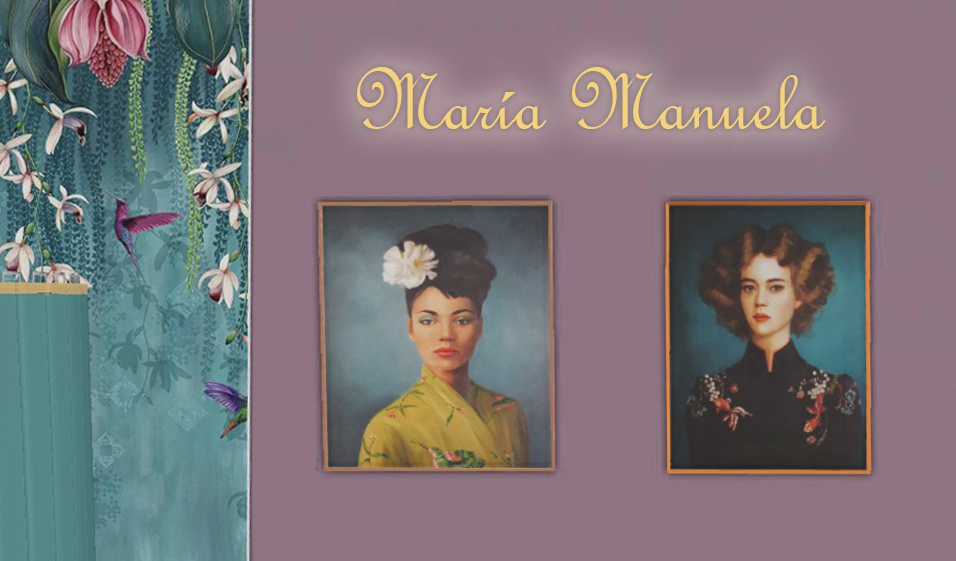 María nos recibe con un sofisticado recogido en moño alto rematado con una gran flor blanca y un vestido de corte japonés amarillo. Manuela, algo más sobria aunque no menos elegante y estilosa, lleva un corte ondulado sobre el cabello corto de tono rojizo y un vestido negro con flores rosas y malva.