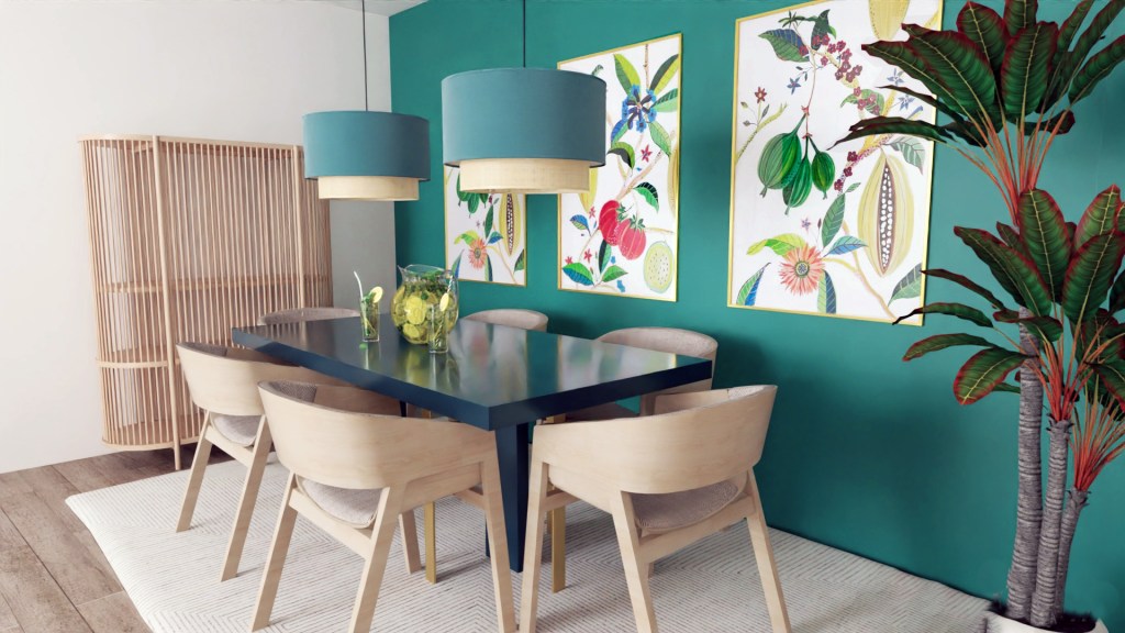 Lamparas colgantes de la Redoute. Sillas escandinavas d madera clara. Mesa de comedor en madera verde esmeralda alto brillo.