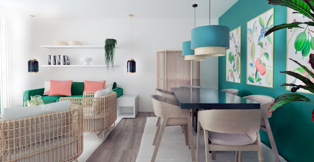Decoración de un salón comedor estilo contemporáneo con notas naturales.