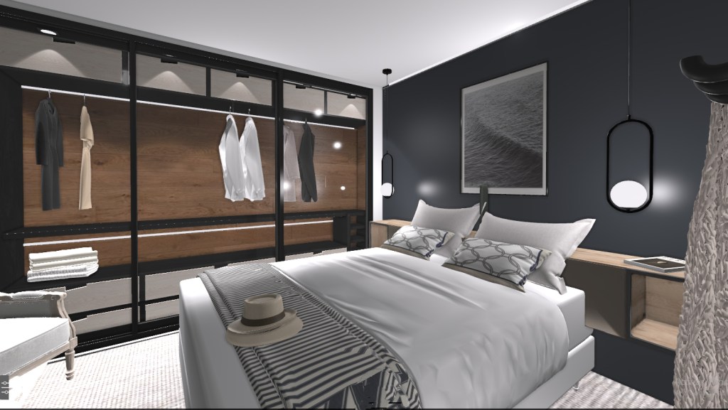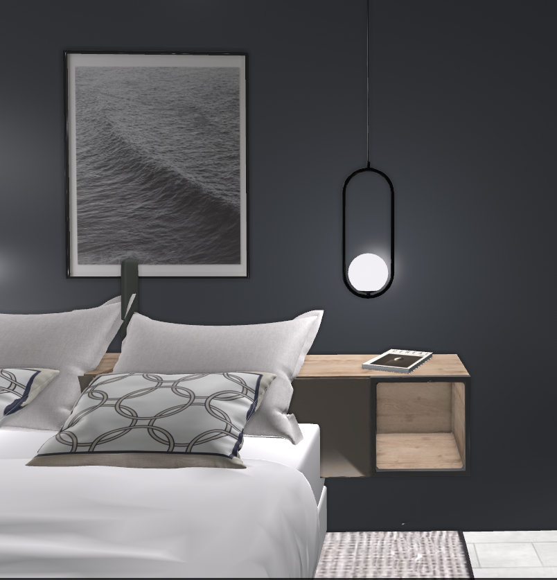 Un dormitorio elegante y muy masculino. La iluminación es la clave aportando mucha calidez. la pared de la cama en gris tiza contrasta con las paredes blancas proporcionando profundidad.
