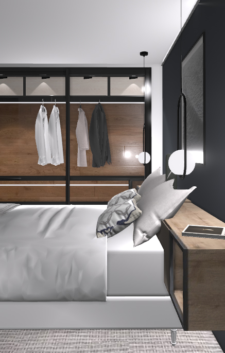 El interior del armario forrado en madera de roble aportar calidez, frente a la perfileria en negro que enmarca el armario.