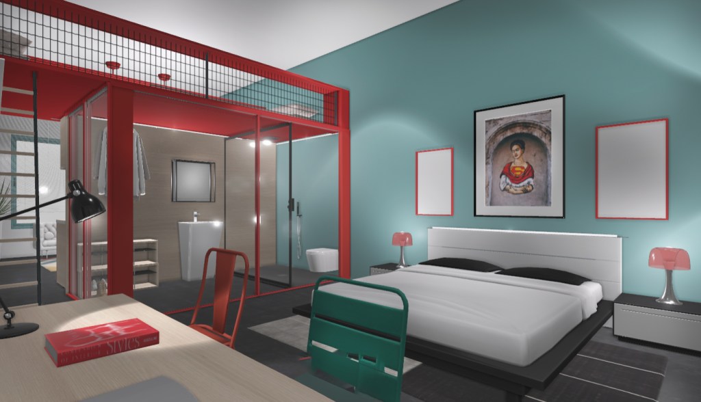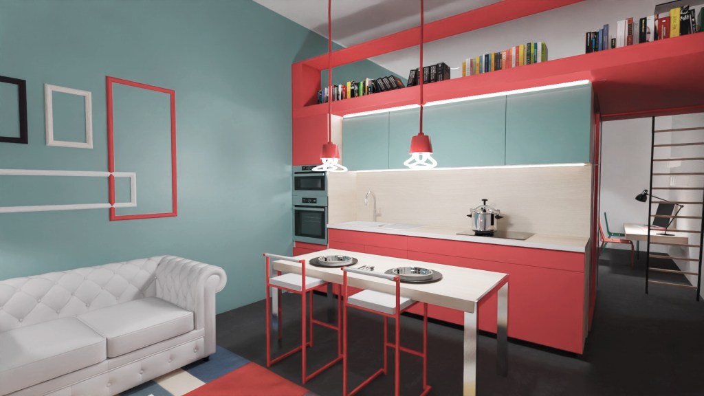 Una estructura en rojo divide el espacio alargado del apartamento en dos: salón y habitación. Por el lado del salón se diseña una cocina sencilla y por el lado opuesto, el baño y el vestidor, ambos separados por una mampara. El techo de la estructura sirve de altillo para coleccionar libros y colocar una cama extra