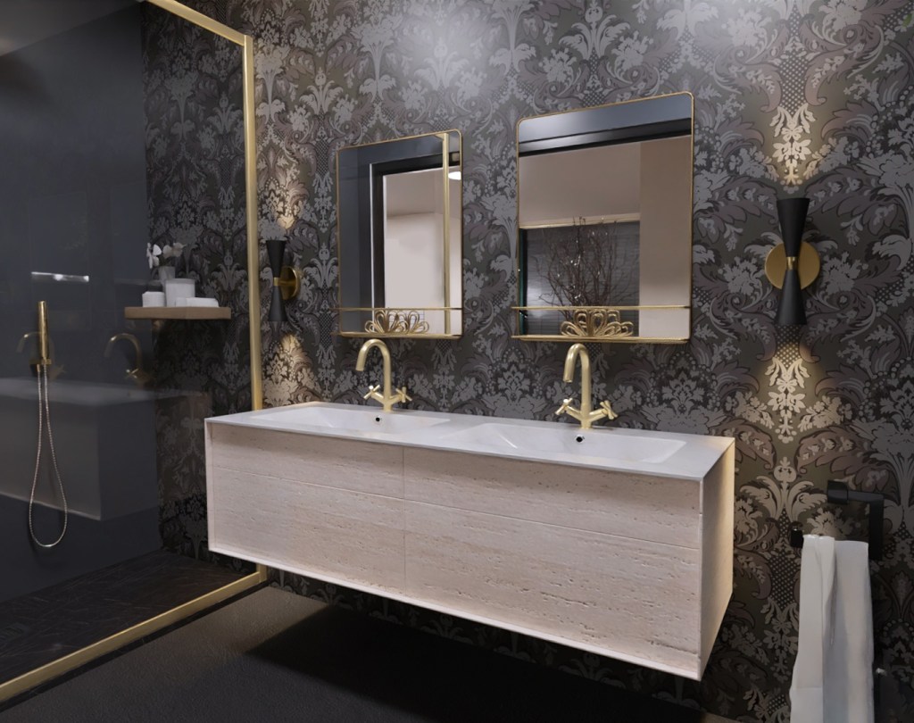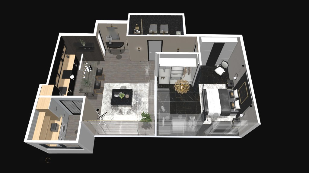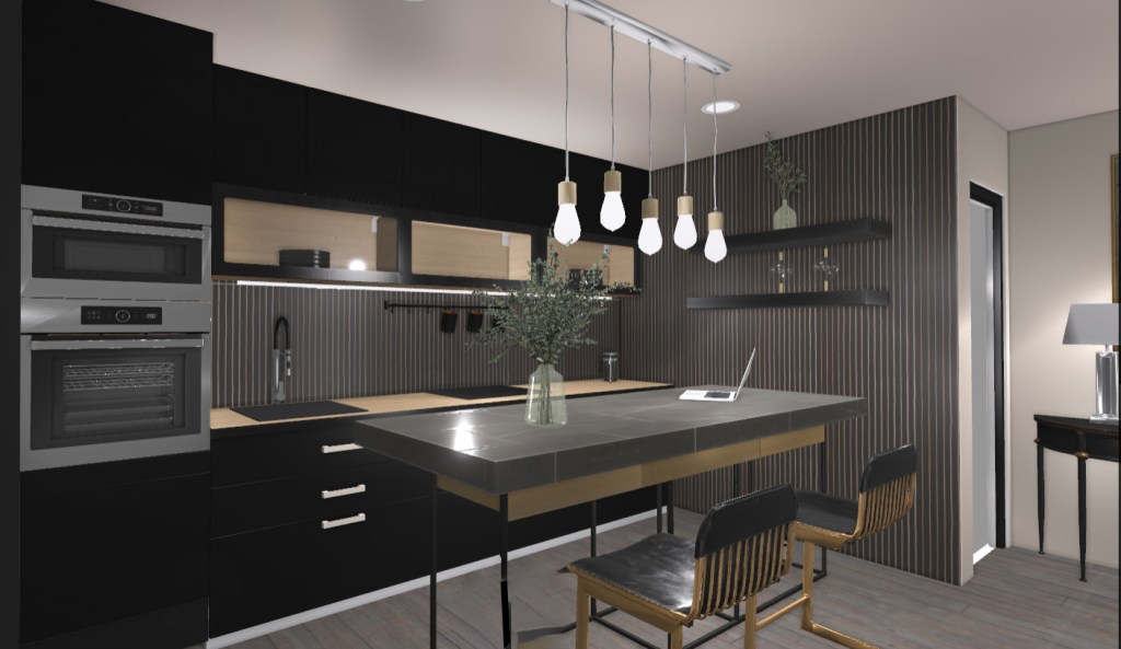La cocina totalmente en negro con armarios bajos abiertos e interiores en madera igual como la encimera. Para la isla se reserva la encimera de marmol negro veteado, el mismo que viste el suelo de la habitación y el baño.
