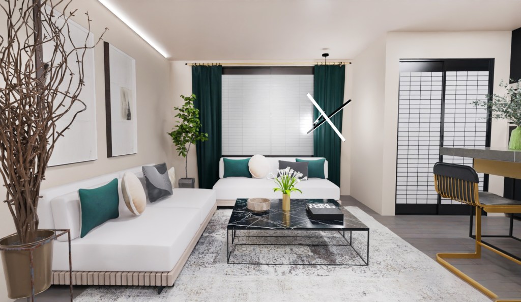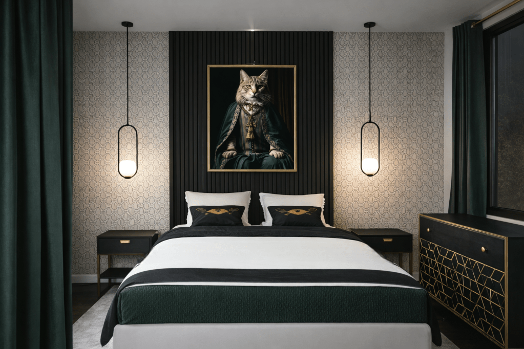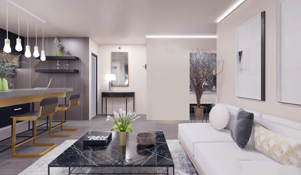 Los propietarios de esta vivienda, un gato elegante y su compañero humano, querían ganar espacio, para ello, sacrificamos la segunda habitación, bastante angosta y sin ventana para convertirla en un gran vestidor. Además se abrió la cocina al salón, separándola con una gran isla que hace las veces de comedor.
