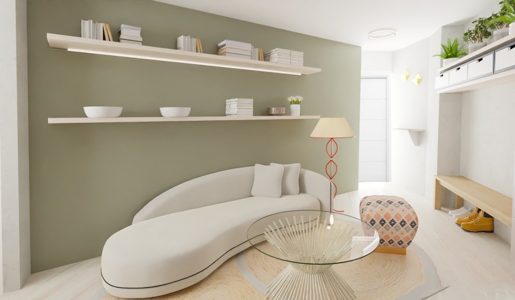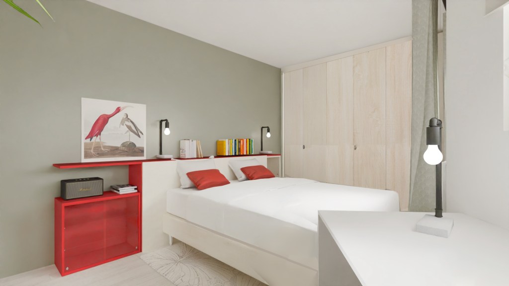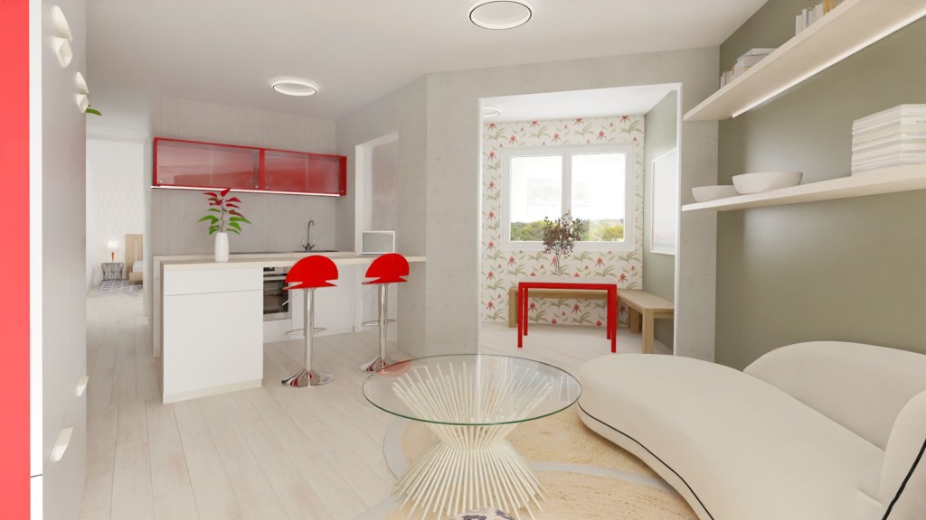 La reforma integral incluye decoración. Buscamos un espacio juvenil atractivo y actual, asi que nos decantamos espacios luminosos, minimalistas y con toques desenfadados. una base de color blanca, un verde oliva en el salón y estampados en algunas paredes, como el comedor o dormitorio. El acento decorativo en rojo y mucho almacenaje con armarios con estructura metálica .