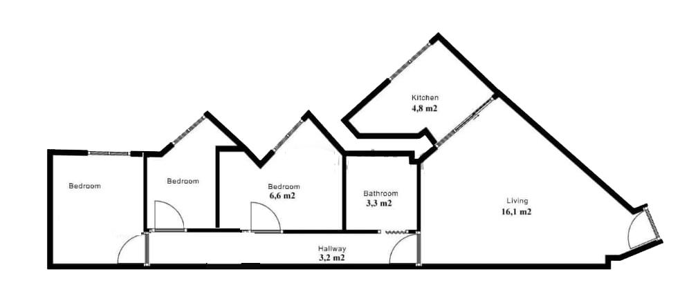 Contemplando la distribución intrincada de esta planta es inevitable pensar en los disparates que se les ocurrían a los constructores de los años 70. No se entienden los ángulos de las habitaciones ni la cocina ubicada, en lo que quizá, debió ser originalmente la terraza.