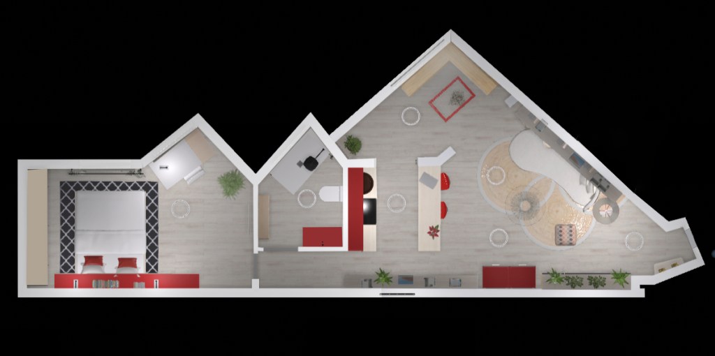 Una vez eliminados tabiques, creamos dos grandes espacios diáfanos, por un lado unimos las tres habitaciones en una doble, con posibilidad de dividirla en dos según las necesidades y en la otra división, creamos una amplia zona común.