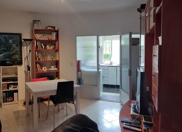 El salón no posee ventana propia, asi que ensanchamos lo máximo posible la puerta que da a la antigua cocina dejando que entre la luz y reconvertimos este espacio en un comedor o zona de trabajo con mesa y bancos adosados a la pared para aprovechar el pequeño espacio disponible.