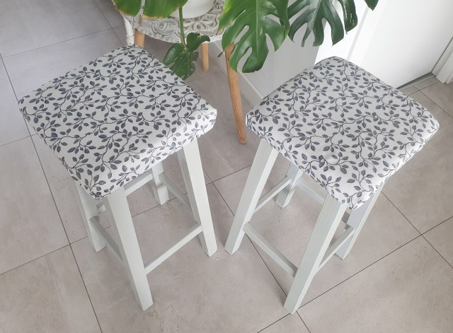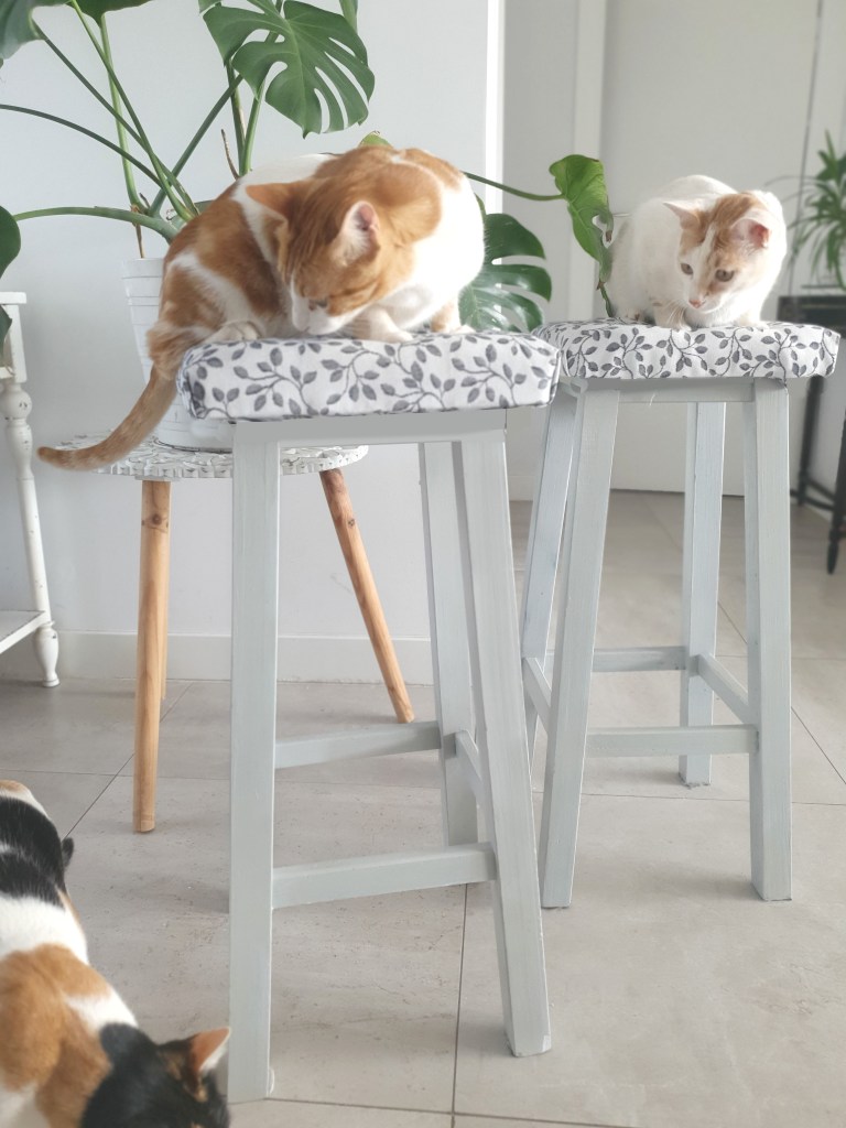 Los gatitos ignoraban estas dos recias banquetas de madera de pino, sin embargo con una base de espuma mullida y una tela resistente y agradable al tacto, se han convertido en su trono favorito.