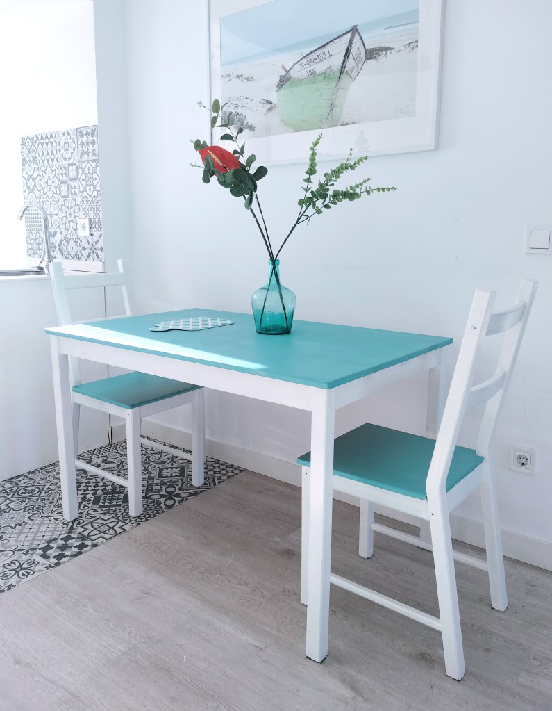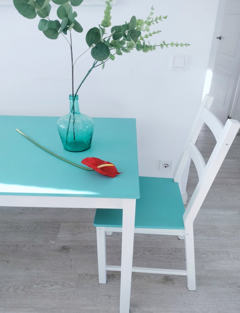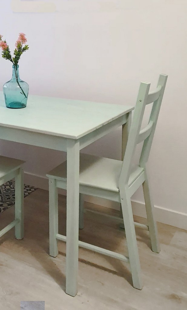 Una mesa de Ikea de madera de pino antes pintada en verde pistacho algo descolorida, ahora vuelve a brillar.