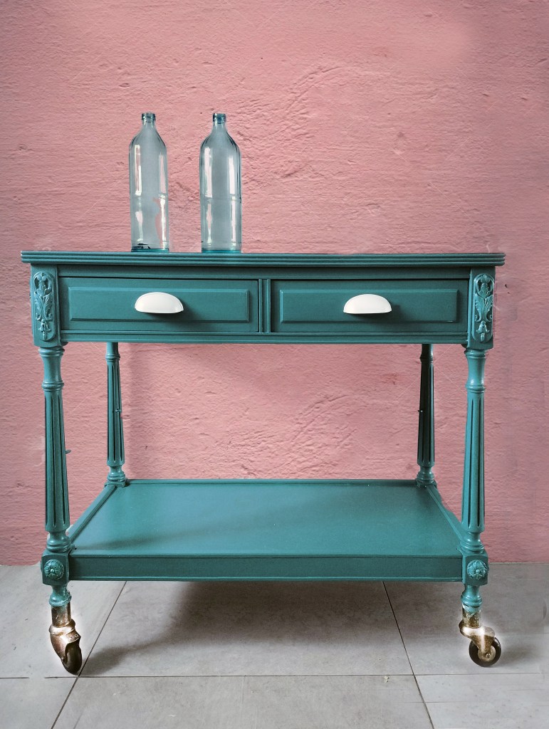 Antigua mesa de televisión convertida en mesa de apoyo para un comedor en una casa de campo. El verde jade proporciona a este espacio tranquilidad y paz.