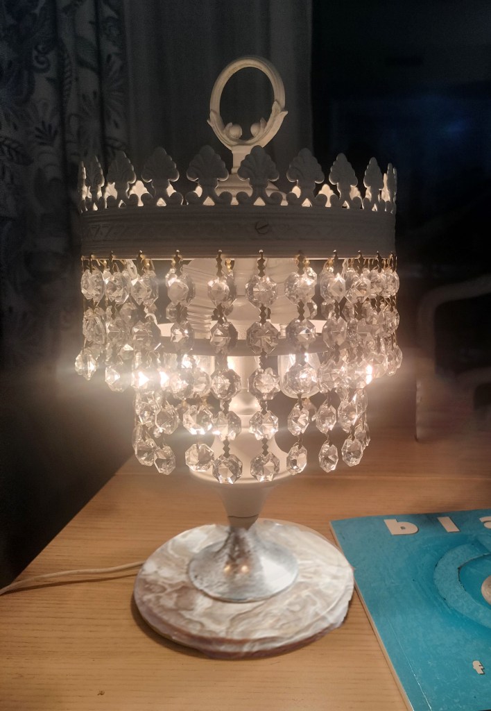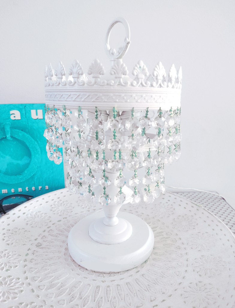 Transformación de una clásica lamparita de lágrimas. Su estructura de latón oxidada y la base de mármol marrón no apetecían nada. Limpié los cristales hasta que brillaron como se merecen y pinté la estructura de latón en blanco satinado, los engastes dorados ahora son verde esmeralda. Parece otra!
