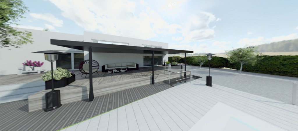 Reforma del exterior de una casa en la zona Oeste de Madrid. Replanteamiento del porche, la entrada secundaria, el jardín y la piscina.